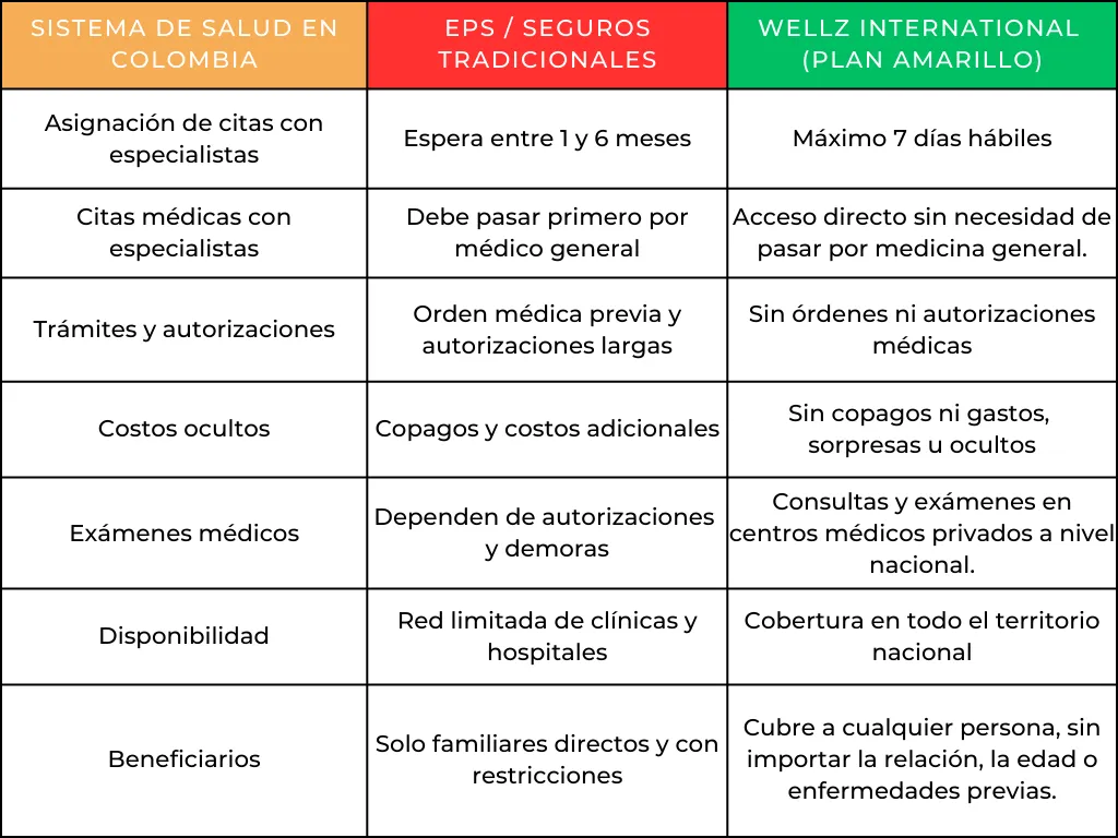 Somos Wellz International, con más de 10 años en el sector, nos especializamos en brindar tranquilidad a los colombianos que viven en el exterior, asegurando que sus familias en Colombia reciban atención médica sin esperar más de 6 meses.